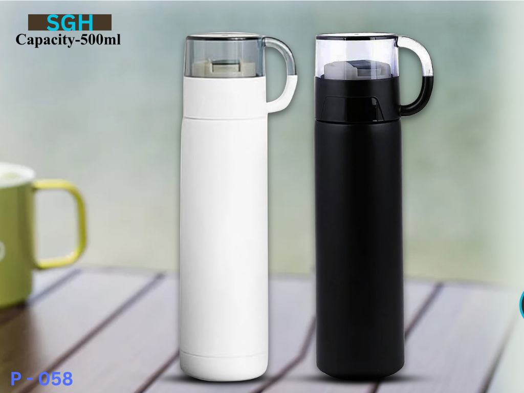 Introducing the SGH 500ml Premium Vacuum Insulated Mug – Model P-058. Crafted from high-grade stainless steel, this bottle-mug hybrid is perfect for keeping your beverages hot or cold for extended periods. Its ergonomic handle and modern lid design make it easy to carry and sip from, making it ideal for home use, travel, or desk-side convenience. The sleek finish and solid grip enhance its visual appeal while providing functionality. Available in elegant black and white variants, this mug is both stylish and practical – a perfect choice for professionals and students alike.